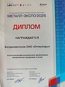 Эффективность системы продвижения продукции Богдановичского ОАО «Огнеупоры» среди потенциальных заказчиков отмечена дипломом в рамках 31-й международной выставки «Металл-Экспо’2025». Предприятие также получило Кубок за лучшую экспозицию – корпоративный стенд, на котором были презентованы огнеупорные изделия собственного производства для металлургической, энергетической промышленности, а также машиностроения.
